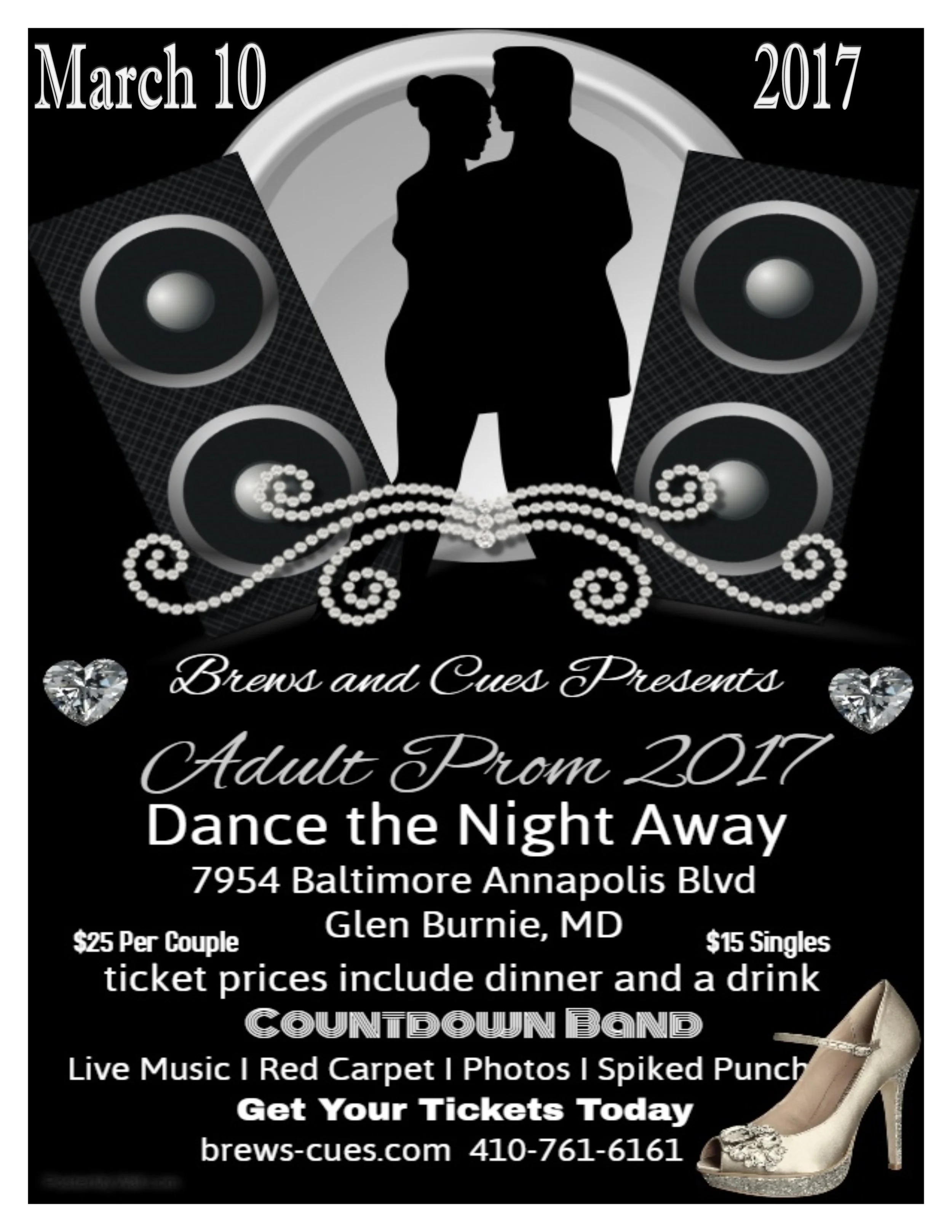 ✚ gCal ✚ iCal Come join us for our spring fling "Adult Prom Night". Photos, dinner, dancing and and live music by Countdown Band. Tickets are available at Brews & Cues. Get all dressed up and get your picture taken with your date or with our great staff. View fullsize