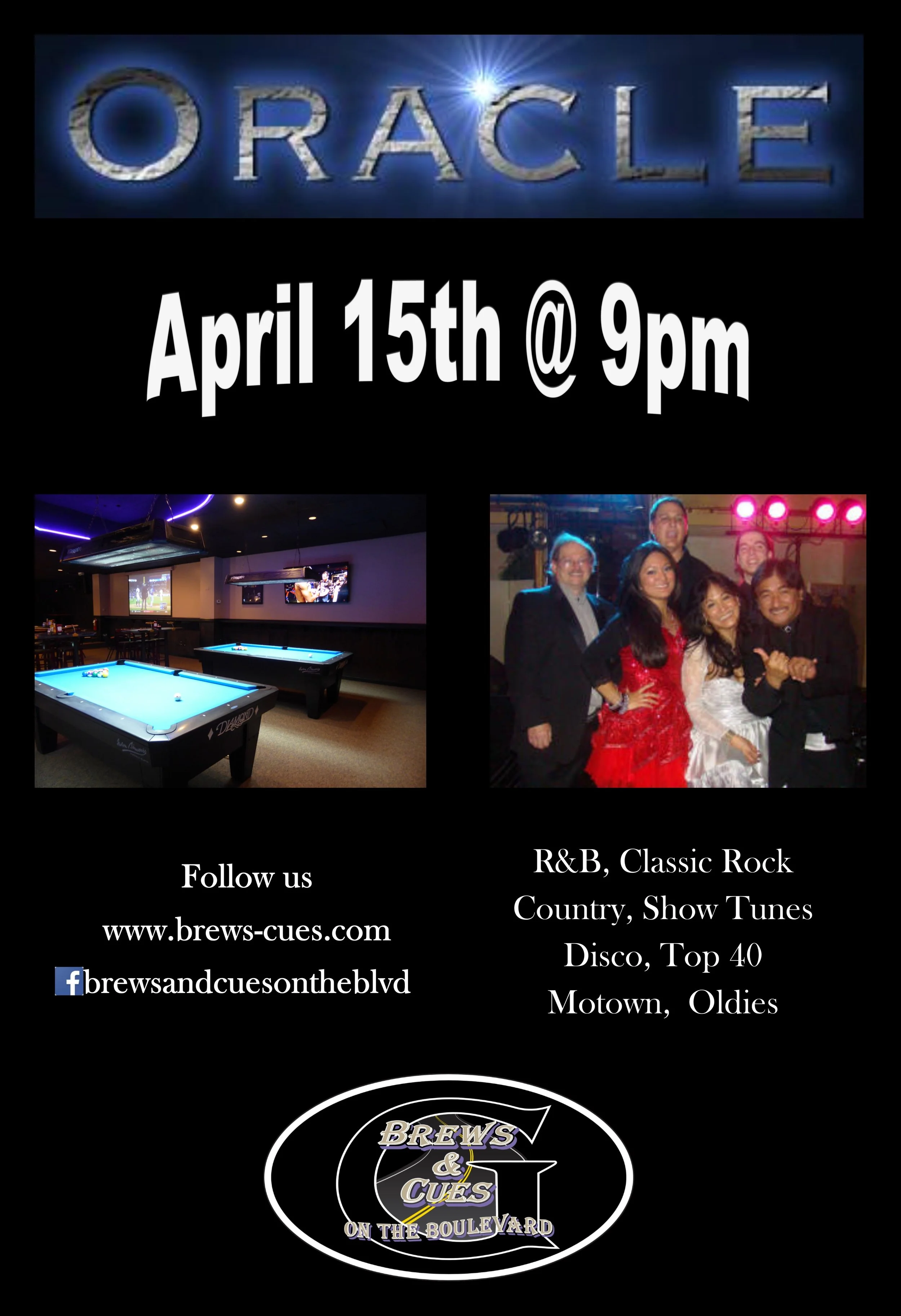✚ gCal ✚ iCal Oracle has been performing as a group since 1999. The group performs a variety of music, including (but not necessarily limited to) the following:Big BandSwingMotownClassic RockTop 40TechnoDiscoCountryR&BShow Tunes and movie themesOldies View fullsize